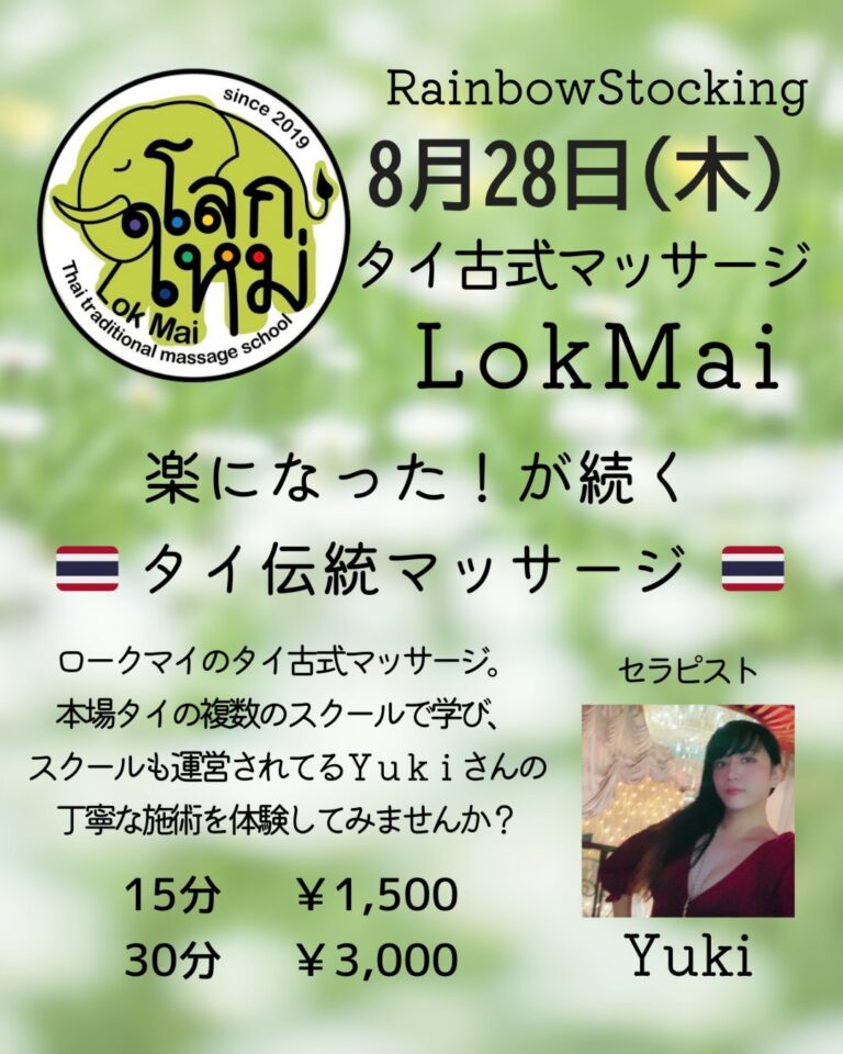 タイ古式マッサージ 開催日: 2025年8月28日 18:00 - LASTカテゴリー: 通常営業 タイ古式マッサージ Lok Mai 楽になった!が続くタイ伝統マッサージ 本場タイの複数のスクールで学び、 ご自身のスクールも運営されてる Yukiさんの施術を体験できます 私たち一押しの Yukiさんの丁寧な施術を是非